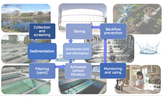 1. Show students a glass of tap water. Ask them what they think is involved in getting this clean drinking water to their taps. Where does it come from (the source) and which processes does it go through from source through to distribution and use?